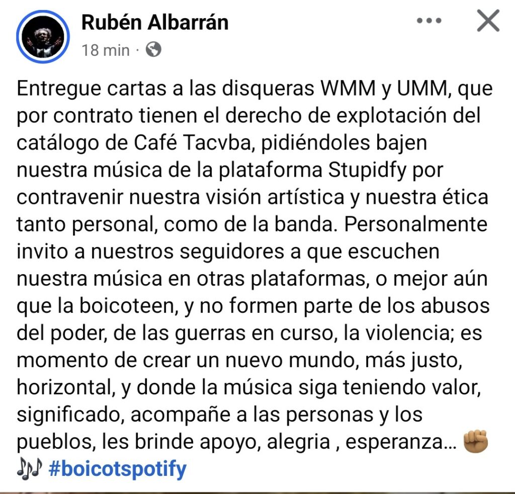 Hoy, el cantante de Café Tacvba, posteo en sus redes un mensaje en donde expresa haber entregado cartas a las disqueras Warner Music México y Universal Music México solicitando la baja de toda su música de la plataforma Spotify.